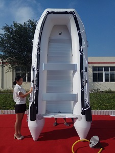 記得以前有個客戶被別的商家忽悠,一條幾百塊的充氣船價格也說可以站立,買回去后別說站立,坐在里面都搖晃的很厲害,相信很多人第一次買都遇過這種事,主要是這種充氣船價格便宜,誘惑力大。聽過很多用戶說怕船不穩定,我們老總就開始重視這個問題,他自己帶了一條船開進湖中,帶的是平底船,剛坐上去就搖晃的很厲害,試過很多次都無法站立。回去后找了很多資料來研究如何能使充氣船可以站立,經過多次實驗驗證,把平底船做成V型底,在船底加固一根充氣龍骨,使充氣船底部成V型,這樣就可以將船上的重力集中到V型底重心部位,這樣即減小了水對船的阻力,也增加了整個船體的穩定性,使船體不易搖晃側翻。內部使用鋁合金板為船的地板,承受能力加強人不易踩空,人現在上面如履平地。